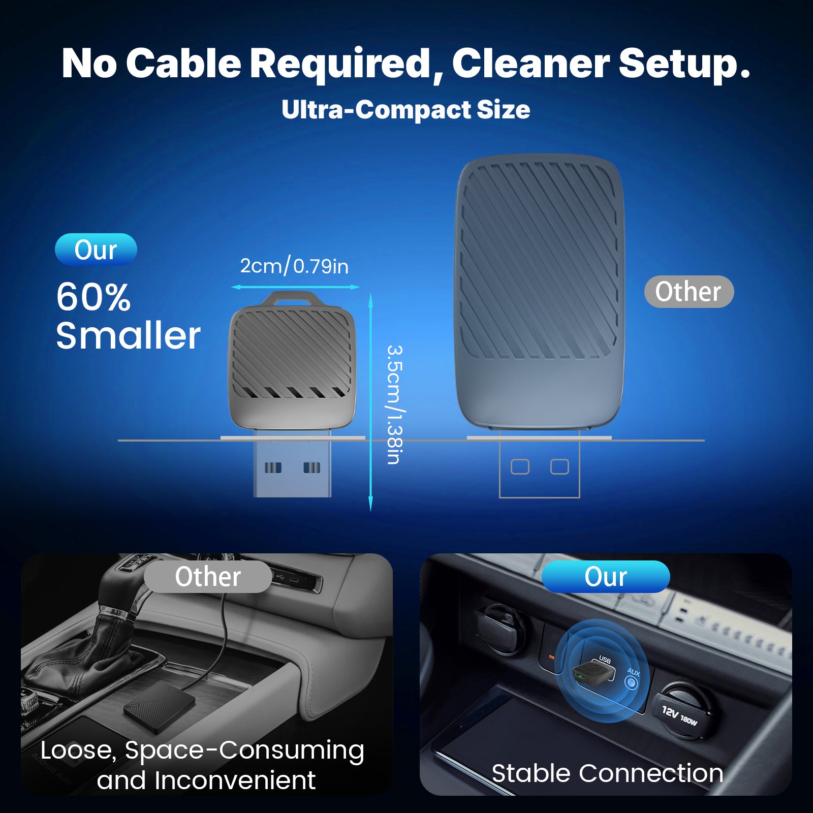 The ultra-compact and sleek wireless CarPlay adapter fits almost flush in your car’s USB port, blending seamlessly into your vehicle’s interior for a clean, minimalist look without clutter. With our upgraded, nearly invisible adapter, effortlessly add wireless functionality to your car's original Apple CarPlay and enjoy wireless access to CarPlay features like music, maps, calls, and more.
